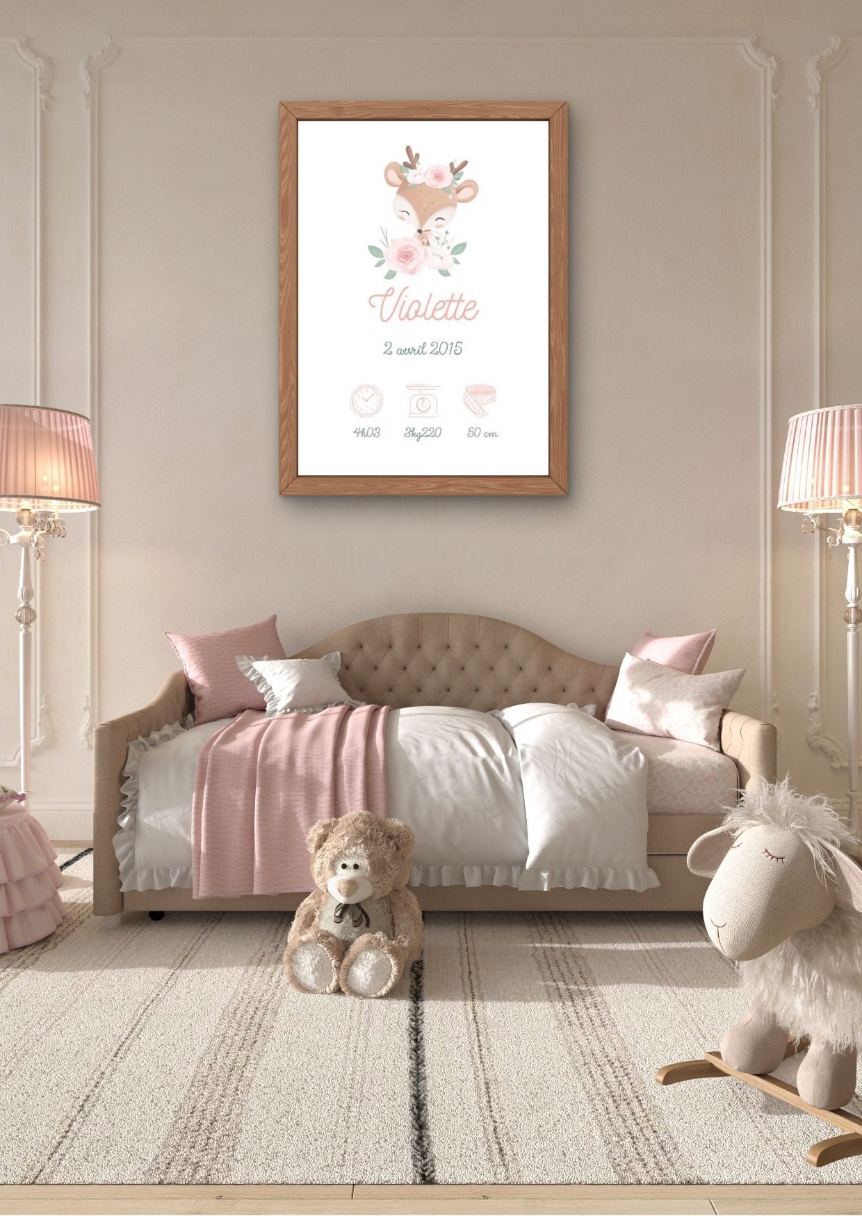 Crée un souvenir tendre et original avec une affiche personnalisée au prénom de ton bébé, accompagnée d’un adorable animal et de ses informations de naissance (date, heure, poids, taille).