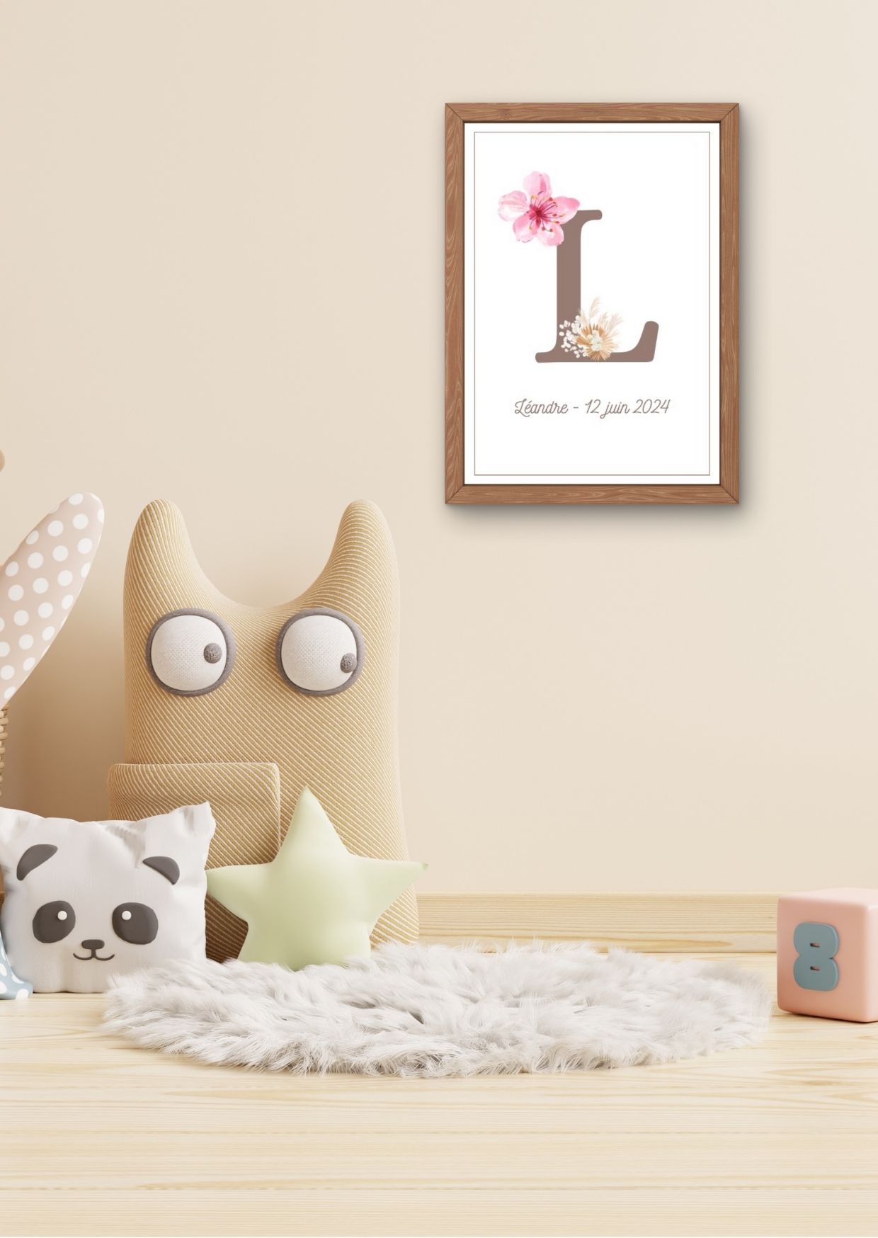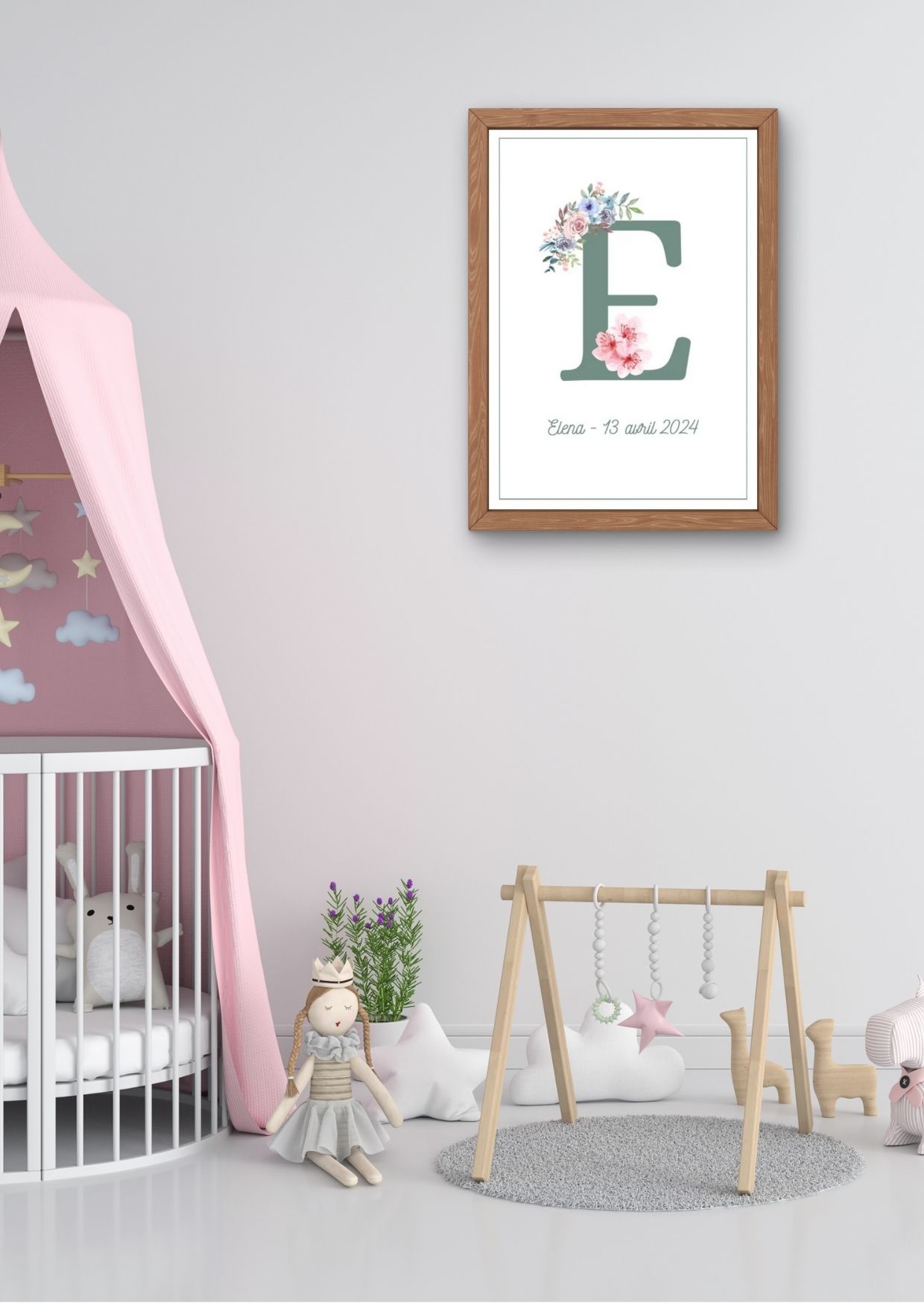 Offre à ton bébé une affiche élégante et personnalisée, où la première lettre de son prénom est sublimée par un magnifique décor floral. Accompagnée de son prénom et sa date de naissance, cette affiche devient un souvenir unique et intemporel.